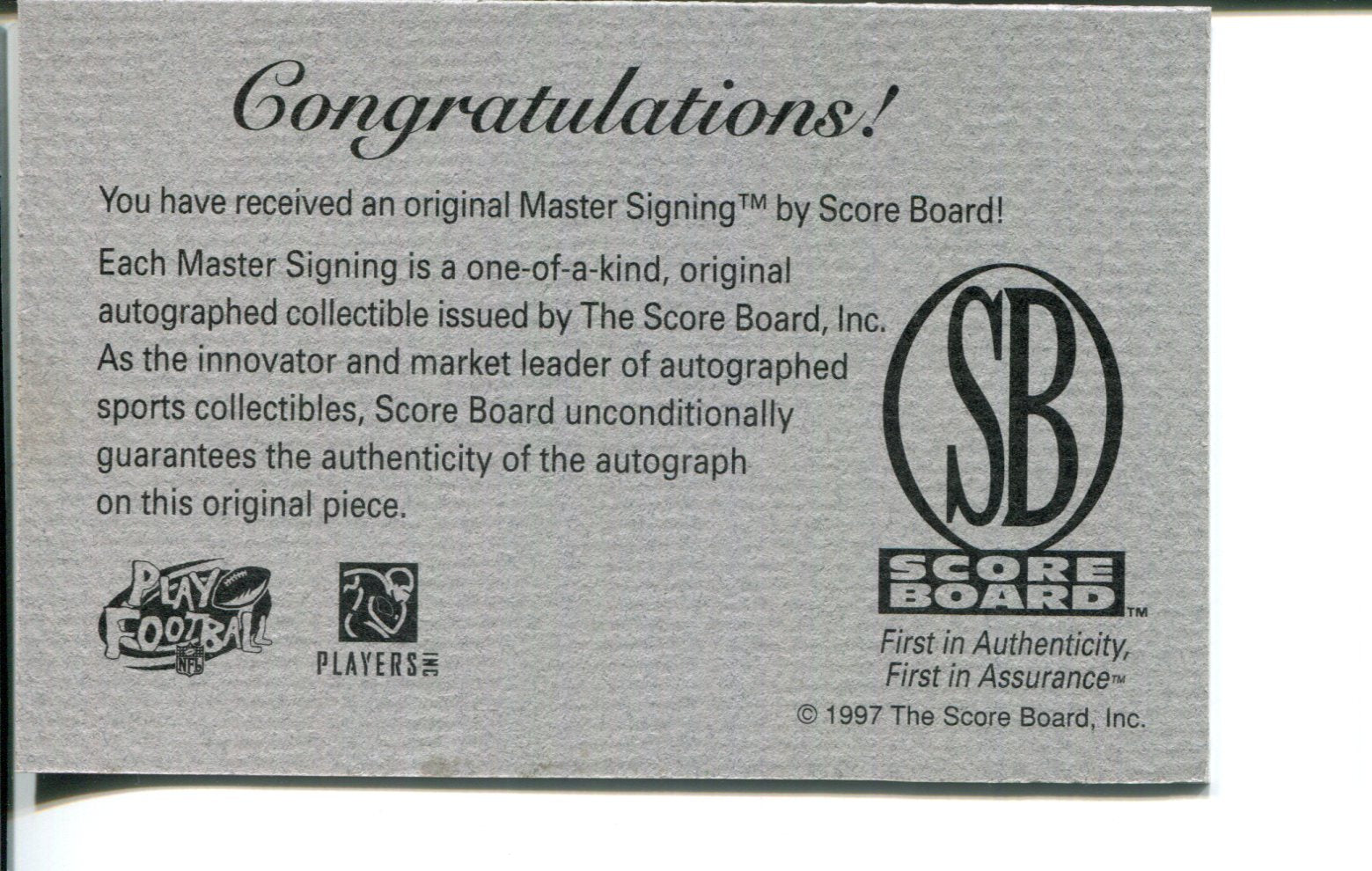 You are purchasing a 1997 Score Board Playbook Master Signing. You will receive the exact item in the photographs. Thank you, Omaha Sports Cards. Listed With Mascot.